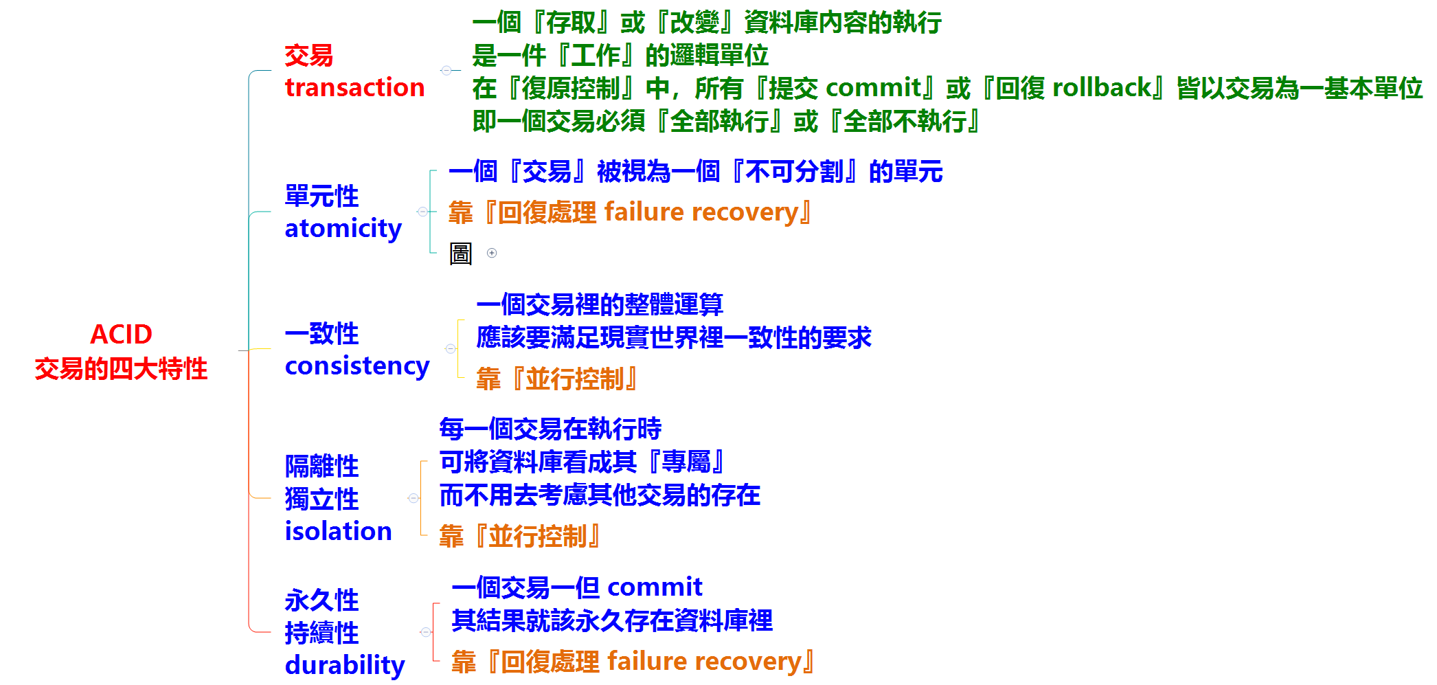 ACID 原則包括:原子性 (Atomicity)、一致性 (Consistency)、隔離性 (Isolation)、持久性 (Durability)。「最終一致性」 (Eventual Consistency) 是 NoSQL 資料庫中 BASE 原則的一部分,與 ACID 的強一致性要求不同。
